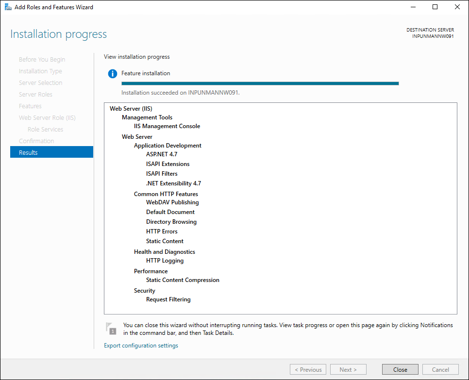 - The features are installed and IIS is configured.