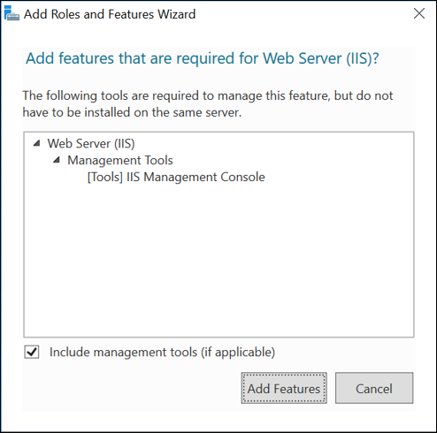 b. Click Add Features. Web Server (IIS) gets selected.