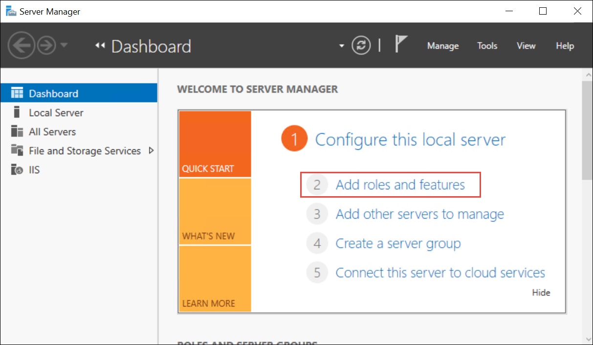 - On the Manage menu, click Add Roles and Features.