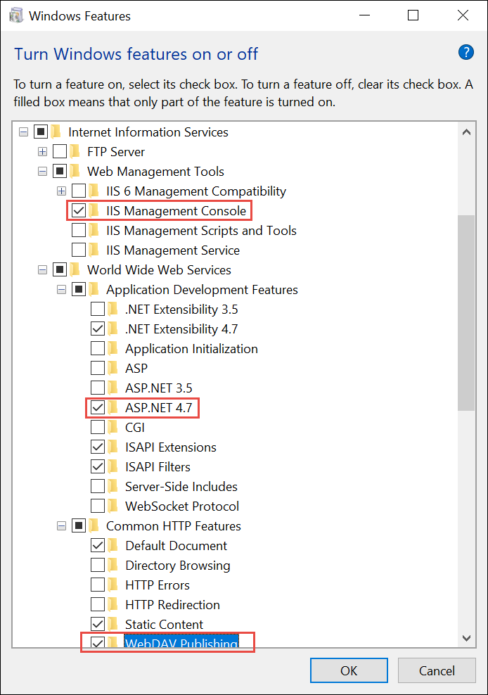 - Expand Internet Information Services > World Wide Web Services > Application Development Features, and select the ASP.NET 4.7 check box (this automatically checks other relevant boxes). For Windows 10 version 2004, select the ASP.NET 4.8 check box.