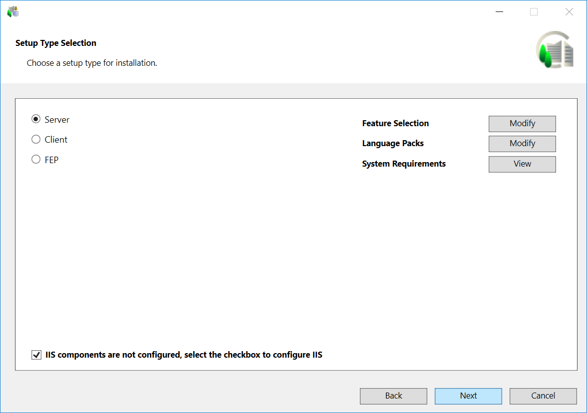 On a fresh computer, where no prerequisites are installed (including IIS), you want to install the Setup type – Server/Client/FEP using the custom installation mode. You can use the same steps to install and configure IIS on the selected Setup type, to configure Server/Client/FEP with local web server (IIS).