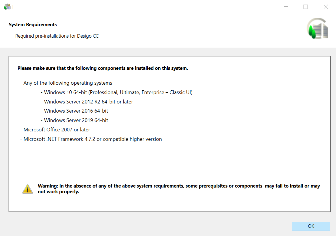 - A error message may display, if the operating system is not supported by Desigo CC . Click OK to abort the installation. Click View Log to open the log file, which informs you about the supported operating systems.
