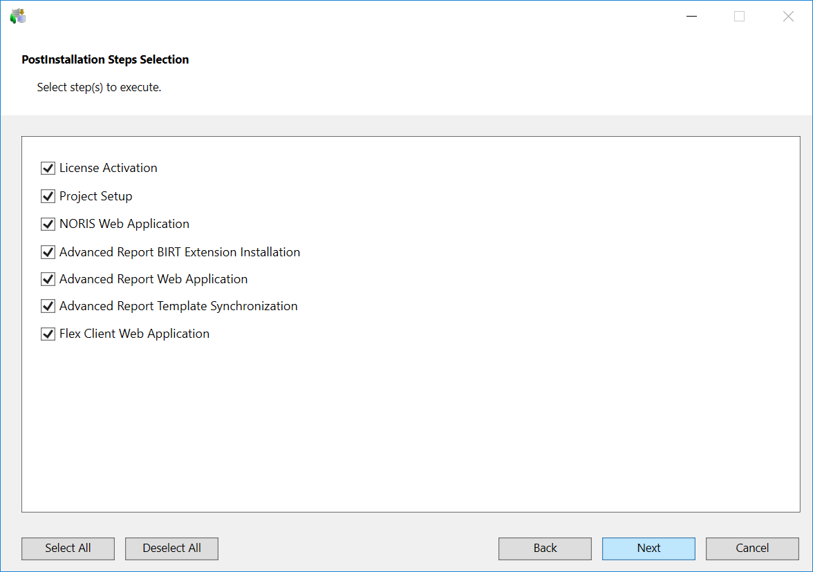 NOTE: Only those post-installation steps, for which the tag is configured as Execute = AskUser in the [GMS/EMName]PostInstallationConfig.txt file, are displayed in the PostInstallation Steps Selection dialog box.