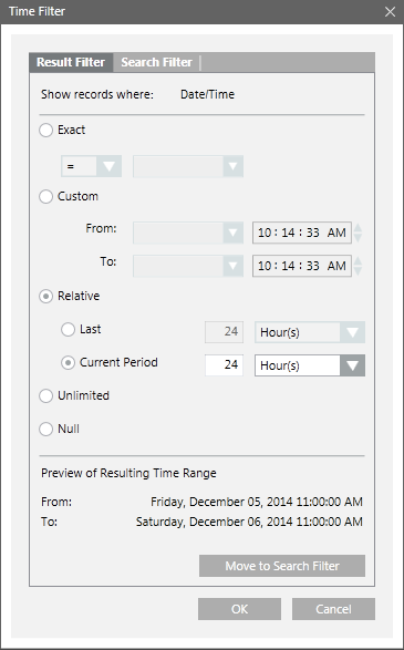 Preview of Resulting Time range | Displays the resulting time range for the options selected in the Time Filter dialog box. For example, if the present time is 08/07/2014 10.35 AM, then for the current 1 hour selection, the Preview of Resulting Time Range displays the following: |