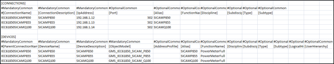 A template of the CSV file (IEC61850_template_3.1_Instances.csv) is present at [Installation Drive]:\GMSProjects\GMSMainProject\profiles\IEC61850DataTemplate. You can create a copy of this file at any location on your hard drive and thereafter modify the information present in the [CONNECTIONS] and [DEVICES] sections as per the device configuration.