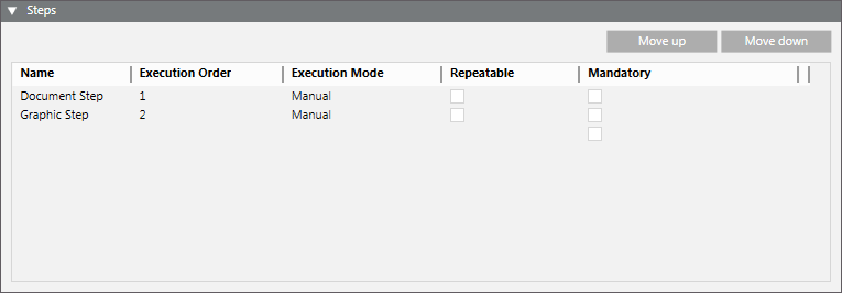 When you configure an operating procedure, the Steps expander displays the list of steps of the currently selected operating procedure and lets you modify some aspects of the steps execution. For more details, see General Settings of a Procedure Step.