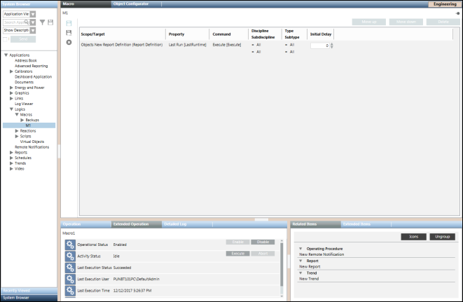 Drag the report definition from System Browser into the Macro tab. This will cause a new row to be created.
