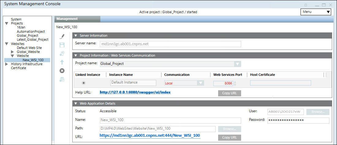 In the SMC tree, select Websites> [Website name]. a. Select the Management tab. b. Select the existing Web Services Application. c. In the Web Application Details expander, click Copy URL.