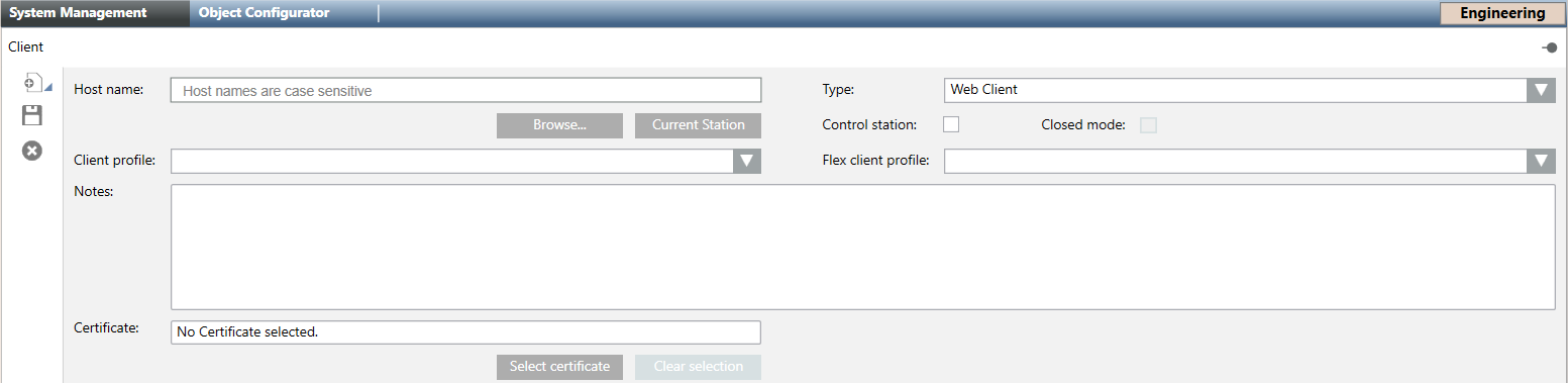 Self-signed certificates and host certificates created with SMC are supported to allow local deployments without the overhead of obtaining commercial certificates. When using self-signed certificates, the owner of the Desigo CC system is responsible for maintaining their validity status, and for manually adding them to and removing them from the list of trusted certificates.