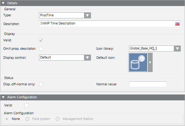 NOTE: The Alarm Configuration settings cannot be used for Time DPE types as Time properties cannot generate events.
