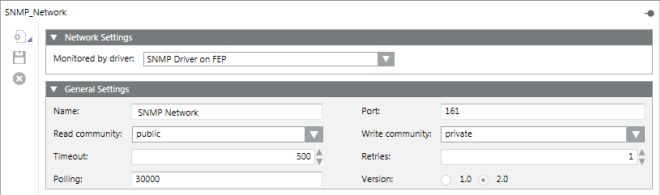 - If you have already imported any SNMP devices (or an individual property) under an SNMP network, once the network driver is set, you cannot change it (the field is read-only). In this situation, if you need to modify the driver, you must first delete the SNMP network and start again with its configuration.