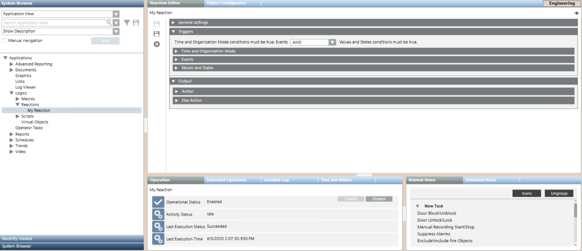In Engineering mode, when you select an existing reaction in System Browser, or select a folder to start configuring a new one, the Reaction Editor tab displays.