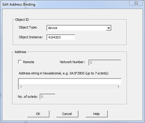IP Address | Enter the IP Address for a device on the network that you want to add to the BBMD table. Adding an entry with the same IP address will overwrite any existing address with that IP Address. Double-clicking on an item in the list will populate the IP Address, UDP Port, and Subnet Mask so that entry can be edited. |