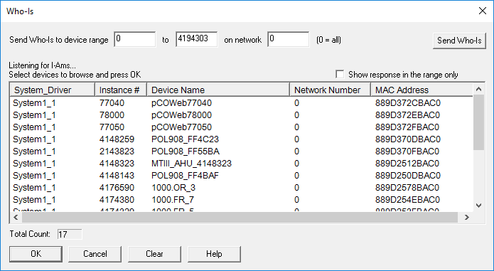 The Who-Is dialog box allows you to send a Who-Is request to devices on the BACnet network. Devices connected to the network within the specified device range display in the list.