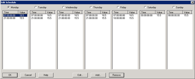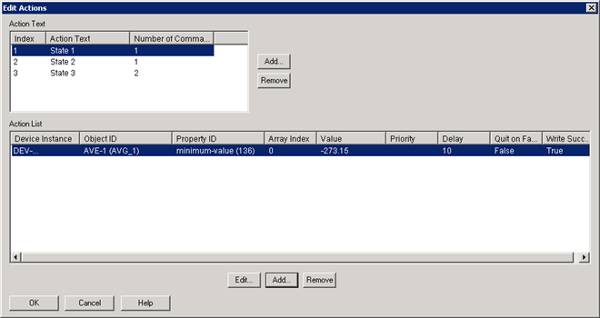The bottom section details the action text command you have highlighted or selected in the top section. It lists the following information: Device Instance, Object ID, Property ID, Array Index, Value, Priority, Delay, Out on Fail, and Write Success along with Edit, Add, and Remove buttons specific to the section. You can edit, add, or remove any number of commands for each action text you have configured.