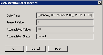 The View Accumulator Record dialog box allows you to view an Accumulator Logging record.
