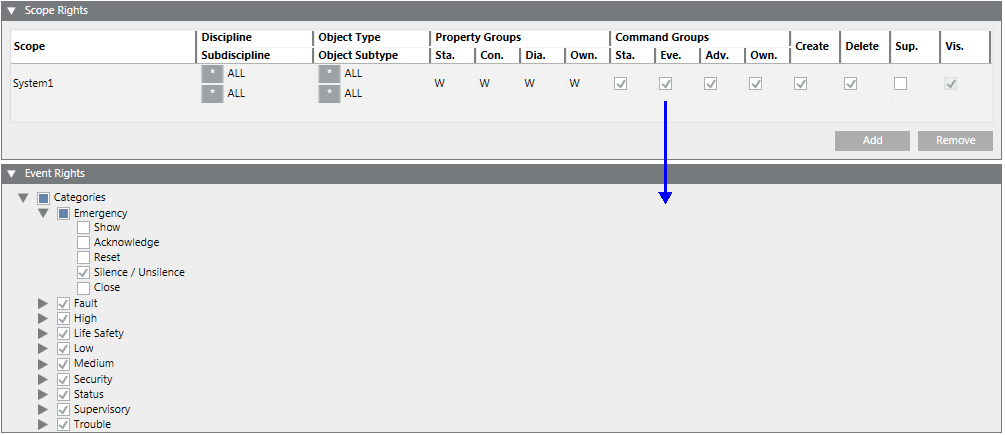- In the Scope Rights expander, the Event check box in the Command Groups section must be enabled to activate the event rights.