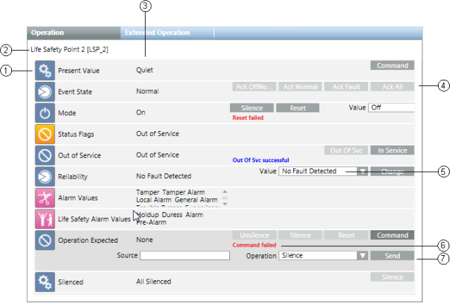 The Extended Operation tab displays the name of the currently selected object(s), a list of properties associated with the object(s), the current value of the properties, and command buttons for initiating commands on commandable properties.