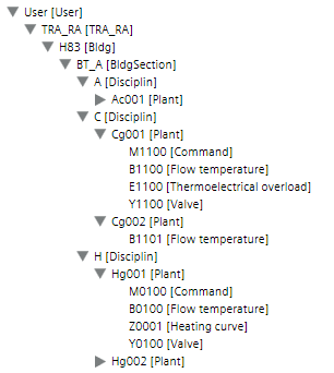 - Logical View: Displays BACnet data points, aggregators and subpoints that are in the database. The visual layout of these objects is based on the point naming convention (technical designation) of the object.