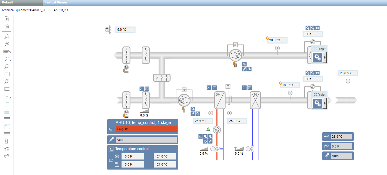 The graphical user interface is the most important interface for operating plants. In Desigo CC, graphic operation takes place in System Browser. The graphics page opens by clicking an object in System Browser (to open the graphics pages, see Navigation Concept). The corresponding graphics page opens based on the selected object: