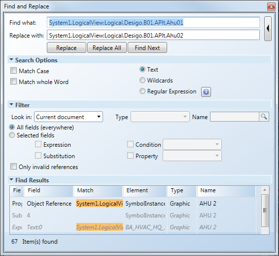 - The object references are replaced. No further object references are displayed in the Find Results dialog box.