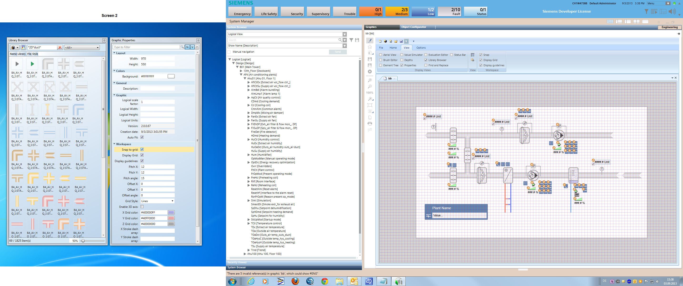 A two-screen solution is useful for graphic engineering. You can open the Graphics Editor on one screen and place the individual views on the second screen. You can save the desired desktop so that the same environment is displayed the next time you start up the Graphics Editor.