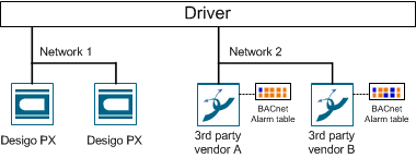 If the AutoDiscovery function is used with Desigo devices, a separate network for third-party BACnet devices must be created because AutoDiscovery can only import standard BACnet objects. Proprietary extensions for Desigo devices are lost during AutoDiscovery.