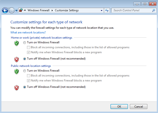 - In the Customize Settings window, select Turn off Windows Firewall (not recommended).