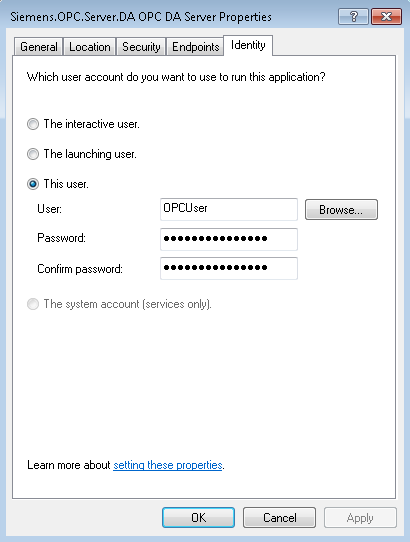 - In the OPC DA Server Properties dialog box, select the Identity tab.