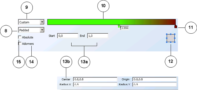 13b | Radial Gradient Control Enter explicit values to define the radial gradient Center, Origin, Radius X, and Radius Y positions. |