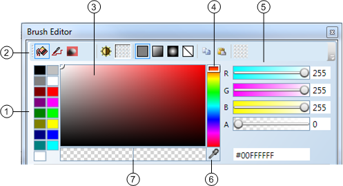 3 | Hue, Saturation, and Value (HSV) Palette Move the mouse over a spectrum of color, ranging in saturation. When the mouse is moved, the current hue is also reflected on the RGBA sliders, the Main brush, and the selected element on the canvas. The hexadecimal value is also updated. |