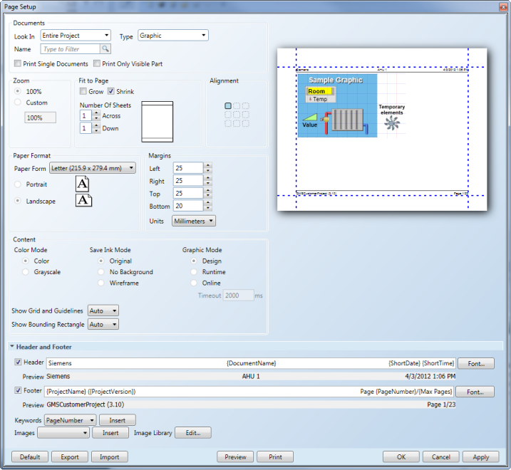 Header and Footer | Add a customized Header and\or Footer to your documents, and then preview how they will appear on the documents. | |