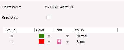 - TxG_HVAC_Alarm_01.1 = This references the Normal state (see above) which is represented by the Color green.