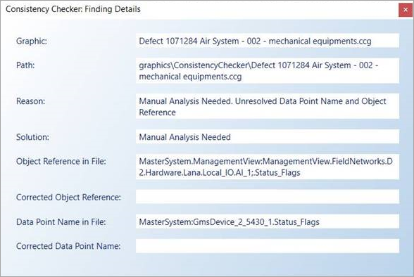 When you run the task, the Consistency Checker, by default, scans through all the .CCG files stored in the projects folder: C:\GMSProjects\[projectName]\graphics and compares the Data Point Name and the Object Reference values in the file against the values saved in the database. If any inconsistencies found are then displayed in the Findings section of the tool.