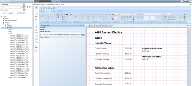 For Example: In System Browser, if you click an AHU node the graphic template in the function assigned to AHU displays. The template is configured, in part, with the expression: {*}.FANEX.AHU_FANEX_CMD;.Present_Value The template displays the resolved CMD status of the object, which is the child node of FANEX” |