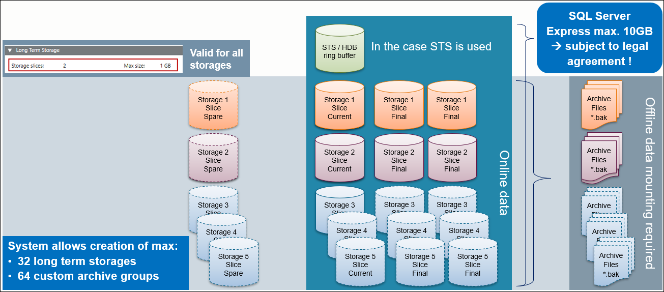 A project can have several archive groups. You can define settings for each archive group separately, whether the data is written to the Short Term Storage (STS) or the Long Term Storage (LTS) (see Configuring History Database in System Browser). Each LTS can have one or more LTS slices. You cannot edit or delete data in the LTS. You can only add data.