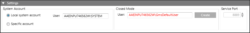If you change the Closed mode user (GmsDefaultUser) password from Windows or if the Closed mode user password has expired, you must change the password of the Closed mode user and configure the Closed mode settings. You can do this in the Closed Mode section of the Settings expander that displays when you select the System node in the SMC tree.