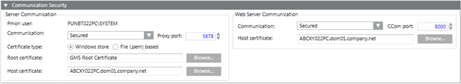 The CommunicationSecurity expander allows you to configure the proxy port for secured Client/Server communication. It also allows you to configure security settings for Client/Server communication and Web communication by use of certificates.