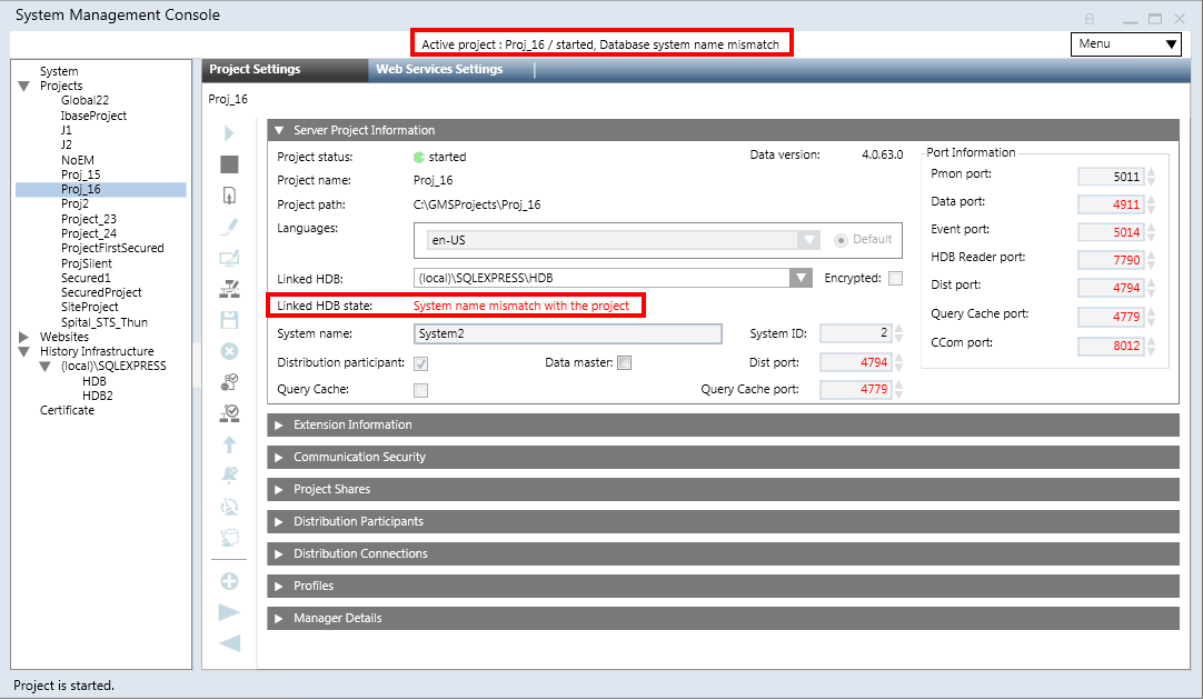 System name mismatch with the project (in red) | The system name in the HDB is different than system name of the project to which the HDB is linked. |
