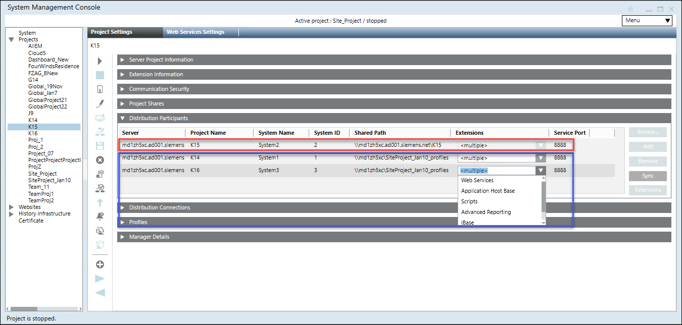 Using the Distribution Participants expander you can configure the distribution participants (projects) available on the same Server or from other Server. You can do this in two ways: