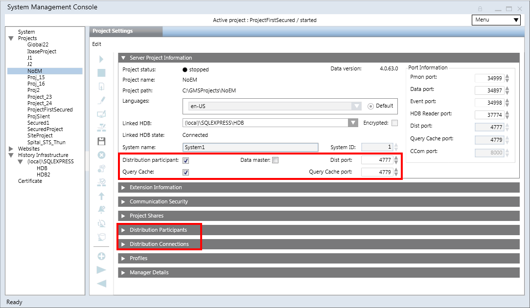 You can view and modify the selected project’s configuration details including the communication security, distribution parameters and so on using the expanders of Project Settings tab and the toolbar icons.