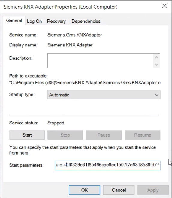In the Services window, right-click the Siemens KNX Adapter and select Start.