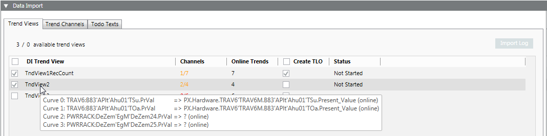 In the Data import expander, select the Trend View tab. Status display: 4/4: All channels were able to be assigned; 5/7 : Only three of seven channels were able to be assigned; 0/6 : No channel was able to be assigned. Check whether you selected the corresponding sites.