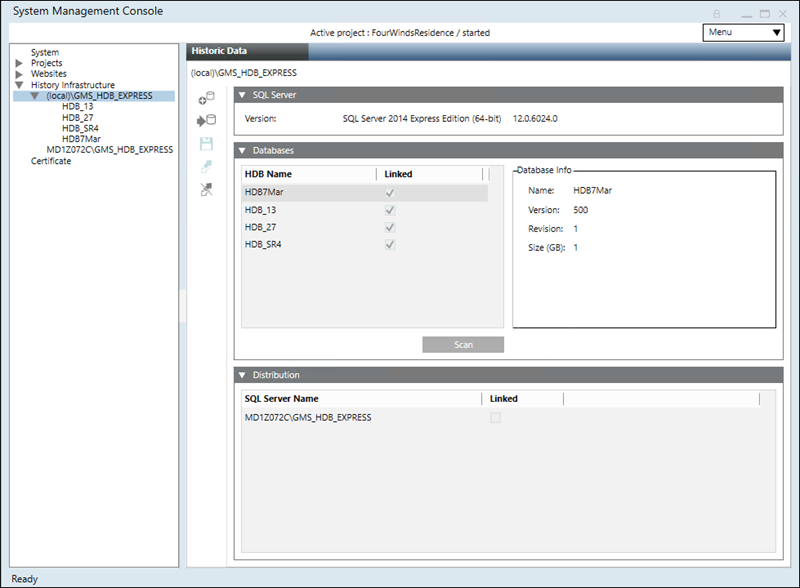 - The History Database is linked and started. The Database Info displays the general settings for the linked History Database.