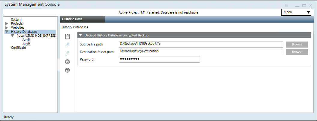 Scenario: You have a history database backup or LTS backup archive which is compressed in 7z Archive (.7z) file type (and 7z.001 (7z.001) file type for split backup files), encrypted with the password stored at a known path on Server. You want to decrypt the history database backup using SMC.