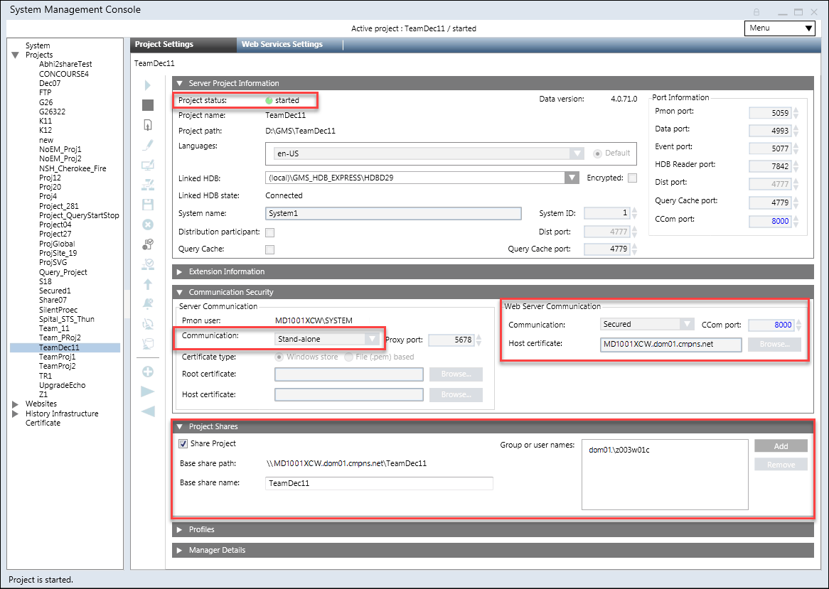 - (Only applicable when the project that you are about to link to the web application is in distribution with other projects) added in the list of allowed users in the Project Shares expander of all the systems (projects) in the distribution with system (project) linked to the web application. - The root certificate (.cer file) of the CCom host certificate of the linked Server project is imported in the Trusted Root Certification Authorities (TRCA) store of the Local machine certificates store.