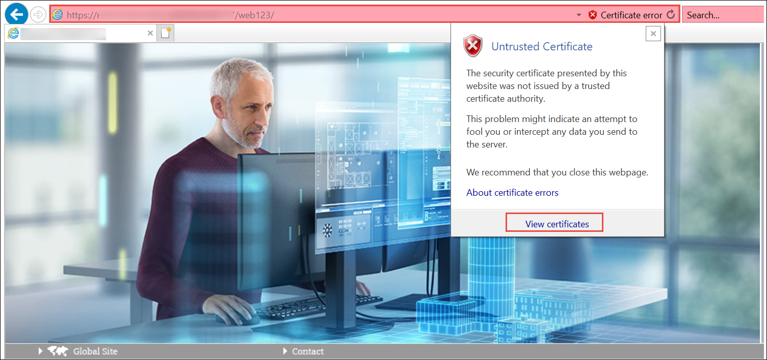 - In the Desigo CC web page address bar, a Certificate Error security report displays.