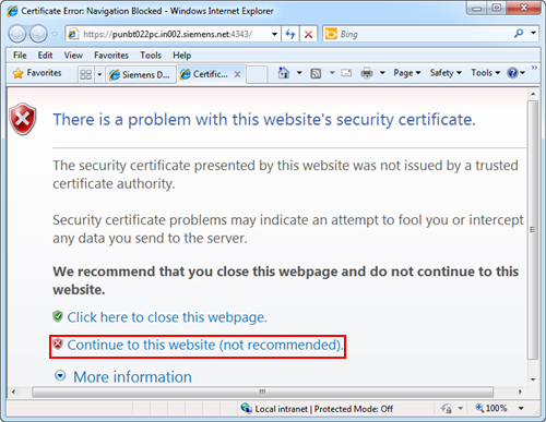- The Certificate Error: Navigation Blocked page displays. This error occurs if the self-signed or host certificate is not already available in the Windows Certificate stores. Usually this error does not occur for the commercial certificates.