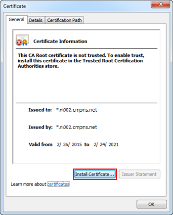 - In the Certificate dialog box that displays, click Install Certificate.