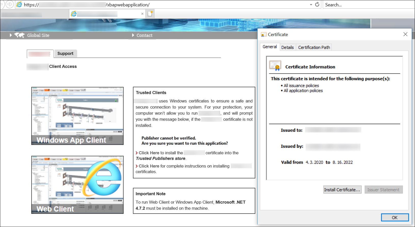NOTE: If host certificates created with SMC are used for signing the Web Application and the Internet browser is configured to check the publisher's certificate revocation, the Security Warning message may display, even after installing the certificate. In this case, you can either add the website to the Trusted Sites zone to resolve the issue or ignore the warning and click Run (for Web client) or Install (for Windows App client).
